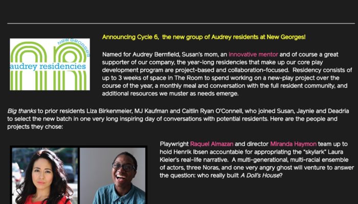 New Georges Artist Residency awarded to Raquel Almazan’s play: Does that Feel Good to you my Lark?: A Doll’s House Adaptation /03 Mar 2019/raquelalmazan/0 CommentOfficial announcement of Raquel Almazan being awarded as a New Georges Audrey Resident artist with New Georges Theatre. She is teamed up with director Miranda... Read More